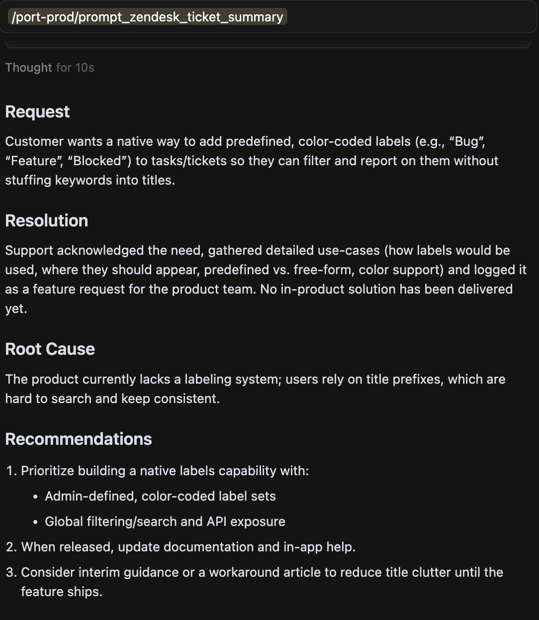 In this guide, we will set up a prompt in Port so that any AI tool that supports the prompt feature of the MCP protocol can help you summarize Zendesk tickets with all the relevant context.